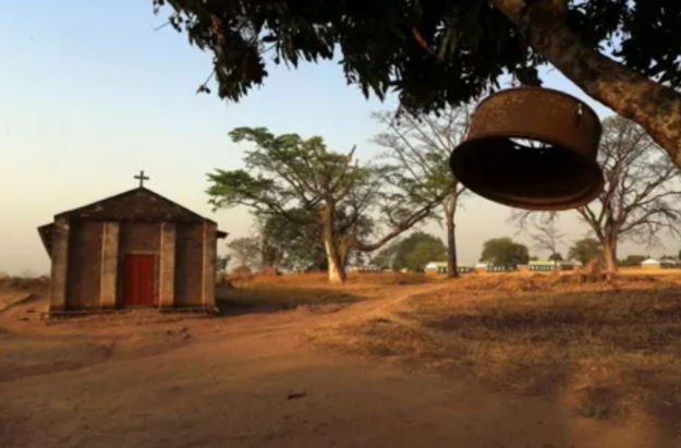 Uganda church A church bell hangs from a tree branch outside a Catholic church and a school in Odek village, Uganda. | REUTERS/JAMES AKENA